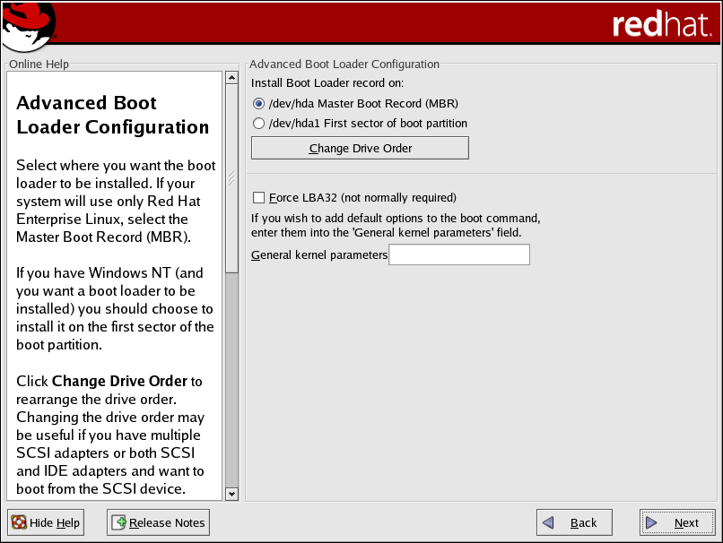 To configure more advance boot loader options, such as changing the drive order or passing options to the kernel, be sure Configure advanced boot loader options is selected before clicking Next.