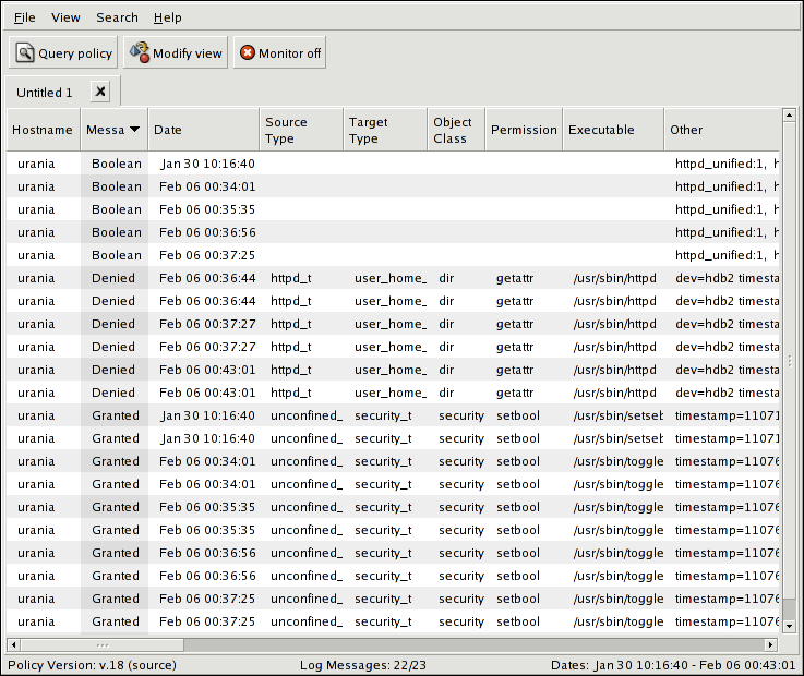 There are several features to seaudit that make it easier to work with the audit messages. The first happens simply by loading a log into seaudit. You find only the SELinux log entries are displayed, with all of the data fields in the log message divided into columns. Clicking on the top of a column sorts the records by that column.
