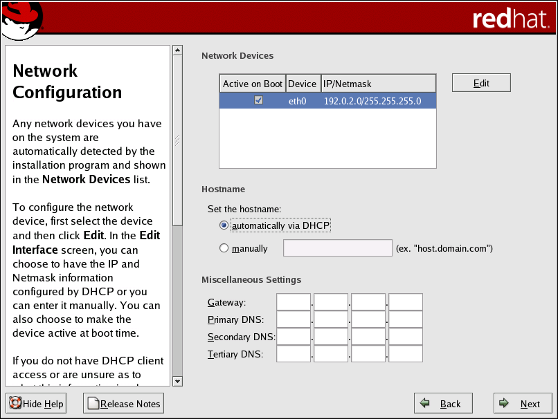 To change your network configuration after you have completed the installation, use the Network Administration Tool.
